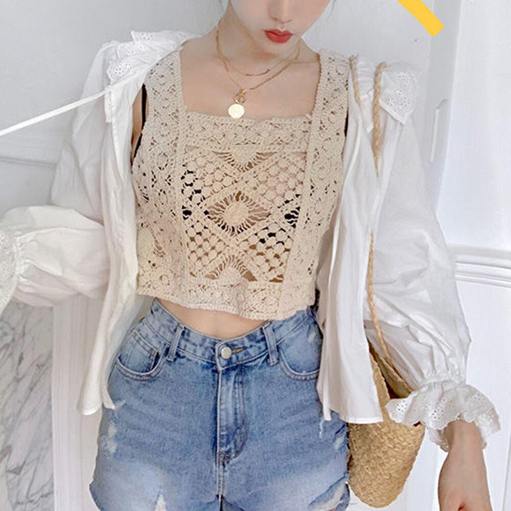 ニットトップス 大人可愛い 透かし編み ニットキャミソール 重ね着 セクシー ショート丈トップス サマーニット 肌見せ 着回し